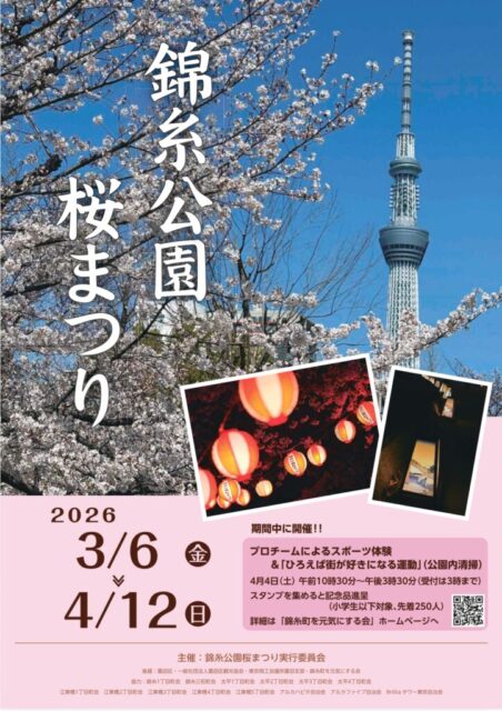 錦糸公園桜まつり実行委員会では、「錦糸公園桜まつり」を開催します。開催期間は長めに設定されており、桜の開花状況にかかわらず、園内でライトアップや提灯、京行灯の設置が行われます。夜間の散策のきっかけとして、公園の春らしい雰囲気を感じられる催しです。